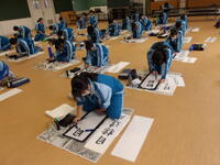 1年生は「平和の光」、2年生は「目標達成」、3年生は「初志貫徹」と、学年ごとに意味のこもった題字に挑戦しました。お手本をよく見ながら、字形や筆遣い、文字のバランスを意識し、何度も書き直す姿から、集中して学習に向き合う様子がうかがえました。