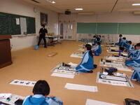国語の時間に、1~3年生が書道に取り組んでいます。会場は多目的教室。静かな空間の中、筆を持つ生徒たちの表情は真剣そのもので、一画一画に思いを込めて書き進めていました。