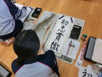 3年生の教室では、国語の書道です。「初志貫徹」という4文字を一懸命書いていました。