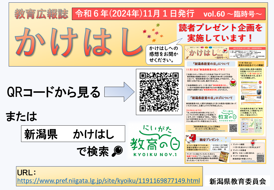 「かけはし」60号 投稿日時 : 2024/11/06 サイト管理者 新潟県教育委員会から「かけはし」60号についておしらせがありました。 ↓ QRコードはここです! かけはし掲載ページQRコード案内.png 0 {{options.likeCount}} {{options.likeCount}} {{options.unlikeCount}} {{options.unlikeCount}}