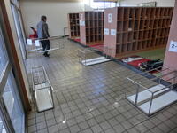 用務員さんが、最近の風雨で汚れた生徒玄関や傘立てを掃除してくれています。