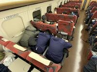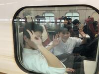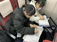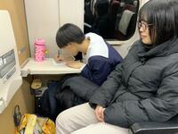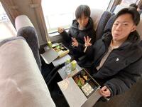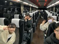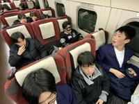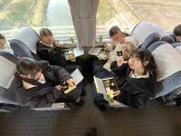 帰りの車内、生徒たちは旅の振り返りをしたり、最後の団らんを楽しんだりと、名残惜しそうに過ごしています。次は金沢駅での乗り継ぎです。一行は、予定通り順調に進んでいます。