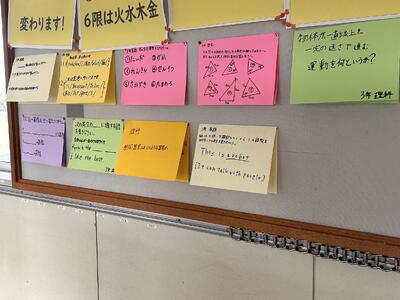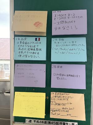 後期は「学習充実期」と位置付けています。進級進学に向けて、力を蓄える時です。そのことを意気に感じてか、各学年の廊下には学習の意欲を高めようとした素晴らしい工夫の掲示があふれていました。このように、「今何に集中しなくてはならないのか」生徒の手で空気感を作っていくということは、とっても大事なことだと思います。みんなで頑張ろう、というその気持ちがあふれている。いい集団として成長していることをうれしく思います。 がんばれ、三中生!