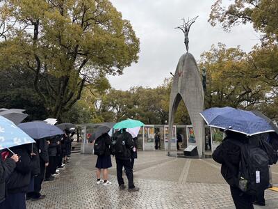 平和記念公園に向かいます。事前学習をして平和への祈りを込めながら、一羽一羽作ってきた折り鶴を奉納する平和セレモニーを行いました。