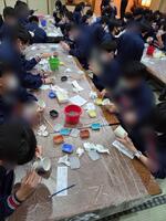事前に、絵付け(清水焼)、念珠、和紙お面作り、の希望をとったグループに分かれて、それぞれご指導いただきます。真剣な眼差しで聞いていましたが、作り始めると一転、それぞれ楽しそうにオリジナル作品作りに没頭です。