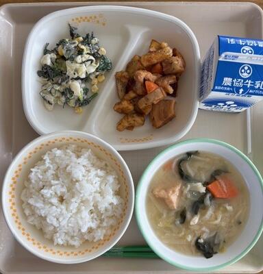 10月24日(金)の給食は、さんまの塩焼き、とん汁、いりどり、ごはん、牛乳でした。さんまの塩焼きは大根おろしがのっていて、おいしかったです。秋晴れにふさわしいメニューでした。
