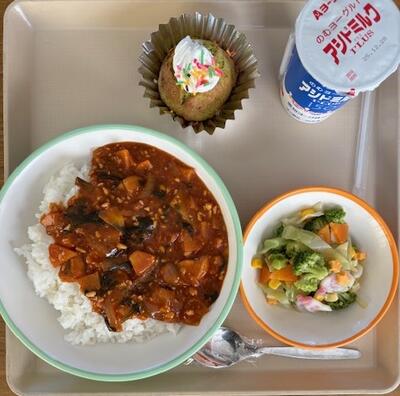 12月19日(金)はクリスマス給食でした。ハヤシライス、もみの木サラダ、手作りのクリスマスカップケーキ、のむヨーグルトでした。前日からケーキを楽しみにしていた子どもたちです。おいしくいただきました。ごちそうさまでした。