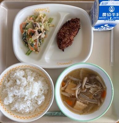 10月23日(木)の給食は、麩っカツ、きのこ汁、かぐら南蛮マヨ和え、ごはん、牛乳でした。麩っカツは、肉と同じような食感がありました。