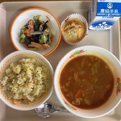 1月19日(月)の給食は、スープカレー、イエローライス、寒天サラダ、アップルカップケーキ、でした。1972年札幌冬季オリンピック、1998年長野冬季オリンピックにちなんだメニューでした。次は、中国の北京オリンピックにちなんだメニューが予定されてます。