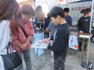 5年生は、西山ふるさと公苑で行われた軽トラック市に参加してきました。販売したのは、二田小の干し柿を使用したラ・プランタンさんとのコラボ柿スイーツです。フィナンシェ、かっきんサンド、パウンドケーキ(バニラ・キャラメル)の4種類です。かっきんサンドは早くも完売しました。秋晴れの中、たくさんの方に出会えて子どもたちも張り切っていました。ふるさと公苑の皆様、ラ・プランタンの皆様、ご協力いただいた皆様、ありがとうございました!