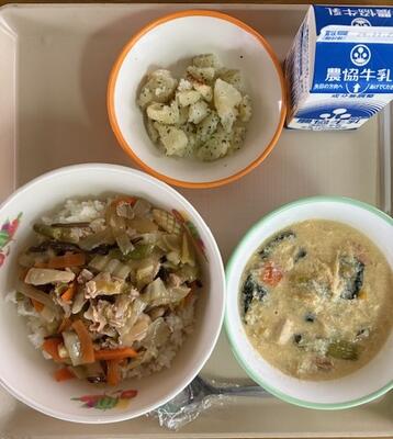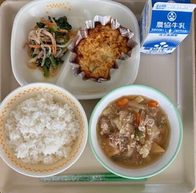 11月17日(月)の給食は、ひじきたまご焼き、じゃがいものそぼろ煮、ごま酢あえ、牛乳、ごはんでした。たくさんの人がお休みしたので、ランチルームが寂しく感じました。お休みしている人が早く元気になることを願ってます。