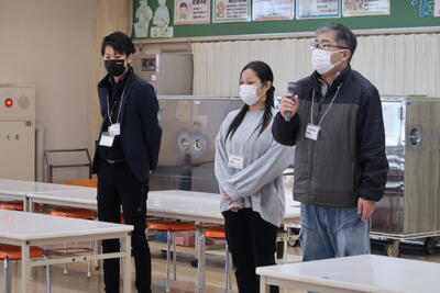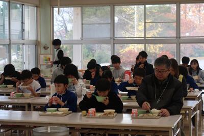今日の給食は、全市一斉地場産デーでした。柏崎の恵みを味わい、地場産物のよさを知る給食メニューでした。株式会社ライフサポートはまたろうの赤澤様と柏崎市農林水産課の山田様からお話を伺いました。本日の給食メニュー「季節野菜のみそ汁」には、はまたろうさんの甘い甘いさつまいもが入っていました。とても美味しかったです。この他、池田養蜂様のはちみつが使用されたサラダ、米山プリンセス(新米)、矢田産マコモダケ、谷根産干しシイタケが入ったマコモバーグのてりやきソースでした。地場産パワーで、インフルエンザに負けずに頑張っていきましょう。