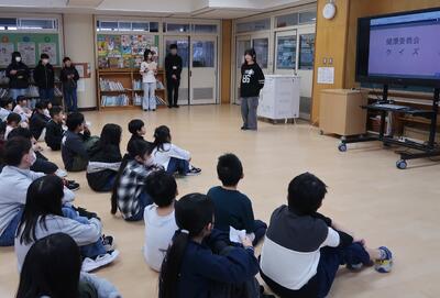 健康委員会主催の若草朝会がありました。「手洗いで洗い残しが多い部分は?」「歯は全部で何本あるか?」など、健康に関するクイズが出題されました。子どもたちは、縦割り班で相談しながら正解を考えていました。楽しみながら健康について学ぶ時間になりました。