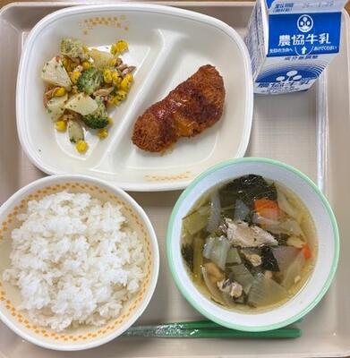 1月14日(水)の給食のメニューは、ちくわの春巻き、しらたきスープ、和風ポテサラ、ごはん、牛乳でした。寒い日は、特にあたたかい給食に感謝ですね。ごちそうさまでした。