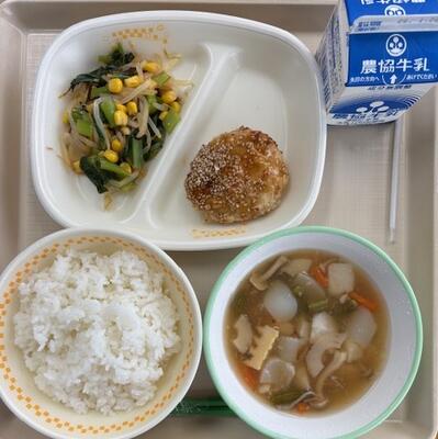 1月15日(木)の給食は、のっぺい汁、とうふつくね、塩昆布あえ、ごはん、牛乳でした。とうふつくねはハンバーグのようでおいしくいただきました。