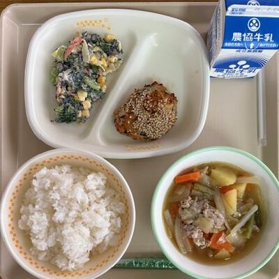 2月16日の給食は、うま塩肉じゃが、とりのつくね焼き、磯マヨサラダ、ごはん、牛乳でした。肉じゃがは、ボリューム感たっぷりでした。