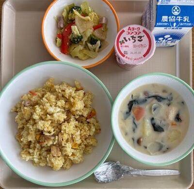 2月20日の給食は、カレーピラフ、ミートボールシチュー、ブロッコリーサラダ、ヨーグルト、牛乳でした。たくさんのミートボールが入ってボリュームあるシチューでした。