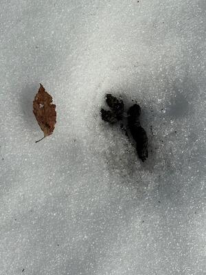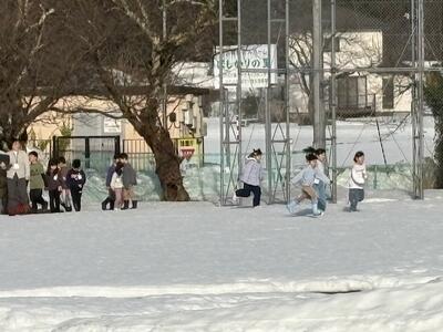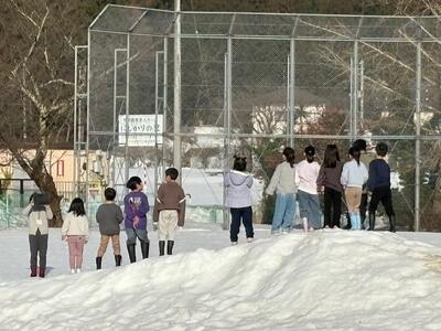 朝、しみわたりをする低学年の姿がありました。「歩くとバリバリ、ジャリジャリと音がしたよ。」「雪がシャキシャキしていました。」「あるけてびっくりしました。雪の上でジャンプしても埋もれなかったよ。」「大量の鳥の羽がありました。何か動物におそわれたかも。」「まっくろなうんちがありました。イノシシかもしれない。」「空に白鳥をみつけました。」「桜の木の上をみると花の芽がでていたよ。」等、しみわたりで見つけたことを報告してくれました。実際に子どもたちの足跡をたどると、子どもの言葉通りの感覚や景色が広がっていました。あらためて「子どもの感性はすごい」と驚かされました。念のため、うんちを調べてみると、イタチやテン、キツネなどの動物が、自分のなわばりを示すためのうんちでした。