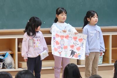 学習発表会、1年生から4年生までの発表内容を紹介します。1年生は、「たいよう学年の1年間」(YOSAKOIでパフォーマンス)、2年生は「あおぞらミュージッククイズショー」3・4年生年生は「器楽演奏『ケセラセラ』、斉唱『おはようのエール』」を発表しました。迫力ある素晴らしい発表でした。