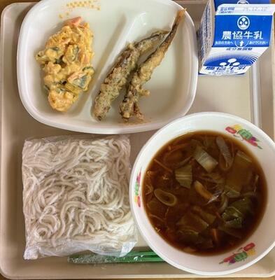 参加をお待ちしてます!交流大会は5日(金)です。(6年生) 投稿日時 : 12/03 サイト管理者 カテゴリ: 6年生のウォーキングフットボールの授業も5回目を迎えました。子どもたちが考えたルールで4チームによるトーナメント戦を行いました。グリーンカードは0.5点、全員に必ずパスを回しシュート等、より楽しくなるルールで行われました。次回は5日(金)13:55~。ぜひ、保護者の皆様、地域の皆様も体育館にお集まりください! 12月3日の給食は、ししゃもののりチーズ揚げ、味噌煮込みうどん、かぼちゃサラダ、牛乳でした。ソフトめんを汁の中に入れて完成!久しぶりのソフトめんでした。