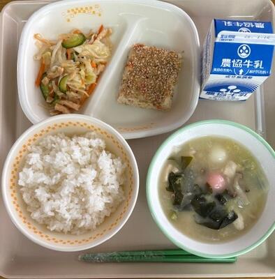 1月9日の給食は、白みそ雑煮、松風焼き、切干大根の五目なます、ごはん、牛乳でした。白みそ雑煮には紅白の白玉もちが入っていました。1月の給食目標は「感謝して食べよう」です。感謝の気持ちを忘れず給食を楽しみましょう。
