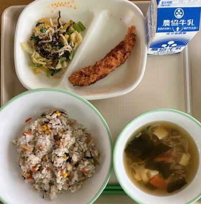3月3日の給食は、えびフライ、すまし汁、辛子和え、菜の花ちらし、牛乳です。メニューからも分かるように、ひな祭り給食でした。あたたかい春はすぐそこまできています。ごちそうさまでした。