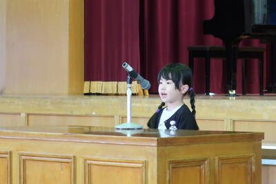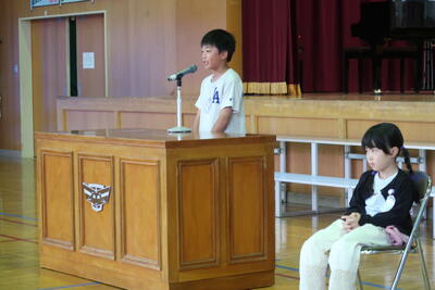 99日間の後期が始まりました。3人の代表が堂々と後期に頑張りたいことを発表しました。特に、5年生のTさんは、前期の自分を振り返り、後期は自分自身、心も成長していきたいという話を、清々しく発表していました。6年生は小学校生活最後の99日になります。悔いのないように過ごしてほしいです。後期の合言葉は、「みんなでつくる」99日です。10月下旬には学習発表会があります。お互いのよさを認め合いながら、みんなで後期の二田小物語をつくっていきましょう。