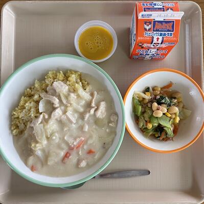 10月14日(火)の給食は、さかさカレー、大豆サラダ、かぼちゃのプリン(手作り)、牛乳でした。気になる「さかさカレー」はご飯がカレーの黄色、ルーがシチューの白と、いつものカレーと色が逆になっていました。牛乳は、頑張れアルビレックス新潟牛乳でした。J1残留をかけて頑張ってほしいです。