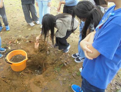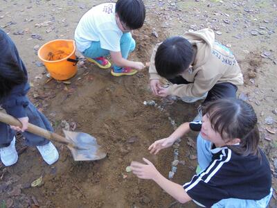クサガメ「アイビー」の卵は孵化しませんでした。子どもたちは、アイビーの卵のお墓をつくりました。気温も低くなってきたので、アイビーを、「今いる児童玄関から教室へ移動させたい」と動き出していました。