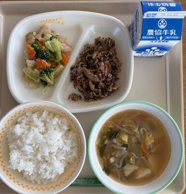 10月7日(火)の給食は、さけのタルタル焼き、どさんこスープ、きのこひたし、ごはん、牛乳です。どさんこスープはやさいたっぷりでした。3年生は4時間目、持久走をグラウンドで頑張っていました。もりもり食べたかな?