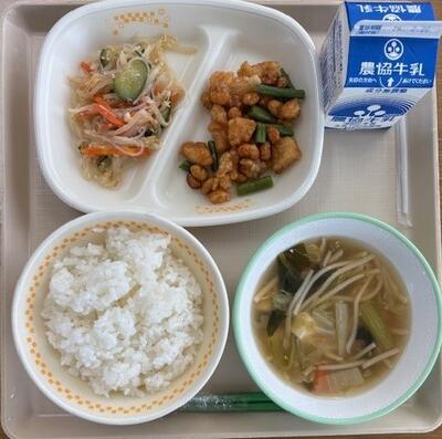 2月13日の給食は、豆腐のスープ、鶏肉と大豆の甘辛がらめ、バンサンスー、ごはん、牛乳でした。今日は秋に柏崎市で収穫した大豆を用いた「ぱくもぐランチ(よく噛んで食べることを意識したメニュー構成)」でした。