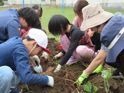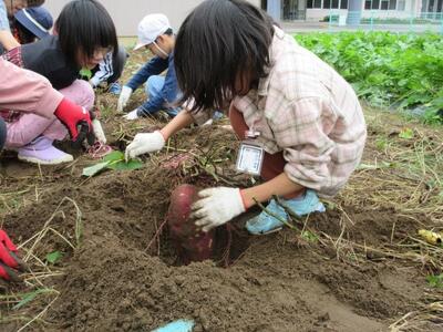 サポート学級のさつまいも畑から、2.3kgのさつまいもがあらわれました。ものすごく大きいさつまいも。1年生の畑でも大きなさつまいもがとれました。しかし、それを上回る大きさでした。掘り出したRさんは大喜び。上越教育大学大学院学校支援ボランティアの先生方はびっくり。秋をからだ全体で感じているサポート学級のみんなです。