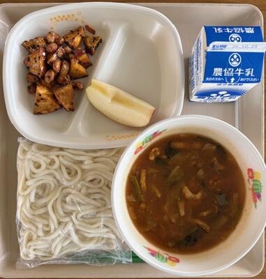 10月22日(水)の給食は、中華めん、カレーうどん汁、大学いも、りんご、牛乳でした。大学いもは、秋を感じさせる一品でした。