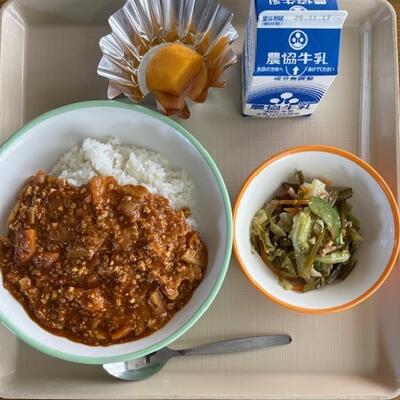 11月6日(木)の給食は、根菜ドライカレー、茎わかめのサラダ、かき、牛乳です。少し、歯ごたえのある給食でおいしかったです。ごちそうさまでした。