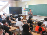 前半は、手話クイズをしました。手話は、ものの形や動きに由来するものや、漢字の形に由来するものがあると聞き、手話クイズに臨んだ子どもたち。「腕時計」や「田」など、音声がなくても、手と口の動きで上手に読み取ることができました。また、他にも、歴史的人物に関連した手話もあることを教えていただき、みんなで驚く場面もありました。