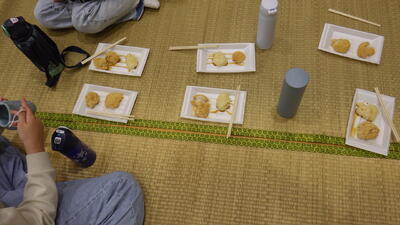 稲作を通じて総合的な学習で学んだことを、ダンスもおり交ぜて発表をしました。その後、杵で餅をつきしました。ついた餅はあんこ、きな粉、砂糖醤油で味付けをしていただき、おいしくいただきました。