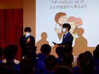3年生→「デートDV予防啓発講座」として、人権擁護委員の方からお話を伺いました。デートDVについて正しい知識を習得することや、デートDVを防止するための手立てや方策について理解を深め、的確な思考と判断に基づいて意思決定できるようになることが目的です。寸劇を交えて、ありがちな場面を想像しながら自分事として考えることができました。