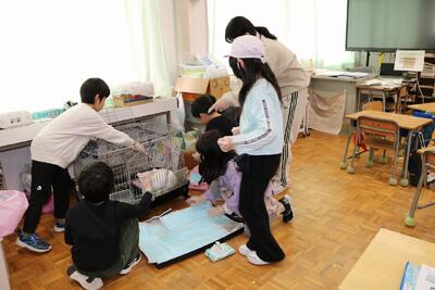 1年生教室では、2年生が1年生にうさぎ当番の仕方を教えてくれていました。