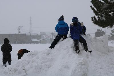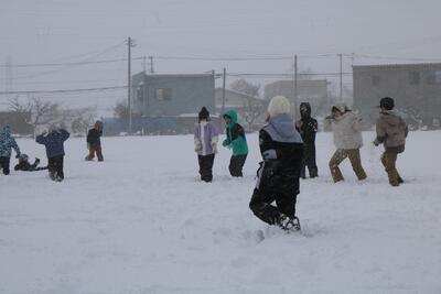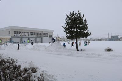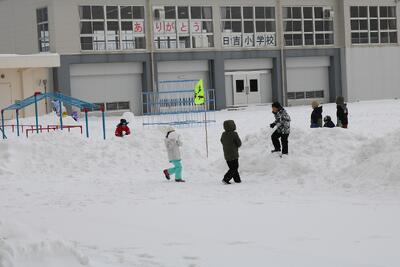 休み時間にちょうど晴れ間が見られ、子どもたちはグラウンドで雪遊びを楽しみました!