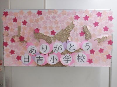 全校の子どもたちで、日吉小学校での思い出を桜の花びらに書きました。頑張ったことや嬉しかったこと、楽しかったこと、たくさんの思い出が書かれました。「ありがとう6年生」、「ありがとう日吉小学校」の気持ちをもって、明日、卒業式、閉校式を迎えます。