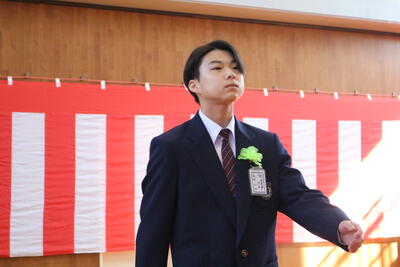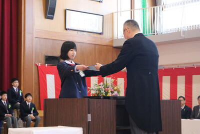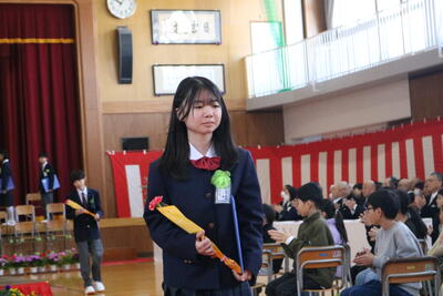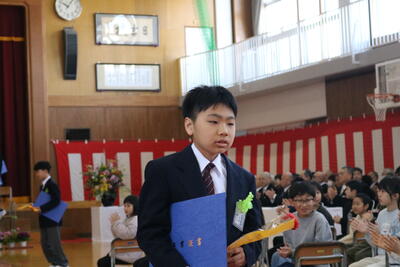 式の最後には、在校生が6年生に向けて今までの感謝と激励の言葉を送りました。それに対して卒業生は、在校生へ向けてエールを送り、「旅立ちの日に(川嶋あい)」を合唱しました。最後まで堂々と歌いきる姿に感動しました。