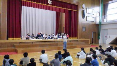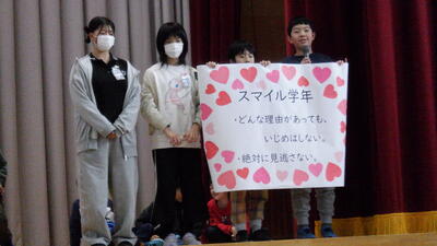 その後、どんなことがいじめになるのか、全体で考えました。「相手が嫌がるあだ名で呼ぶ」「暴力する」「嫌なことを言う」「相手が嫌だと思ったらいじめになる」など、発言がありました。「相手がどう思うかをよく考えて行動する」ことの大切さを全校で確認しました。