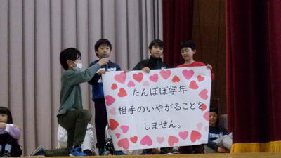 「みんなで仲良く遊ぶ」「相手の気持ちを考えて行動する」「相手の嫌がることはしない」など、学年で決めたメッセージを学年代表の子どもたちが宣言しました。