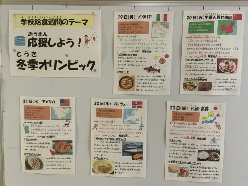 1月19日(月)~23日(金)は「学校給食週間」です。今年度は、2月に開催される「2026ミラノ・コルティナ冬季オリンピック」にちなみ、今までに開催された冬季オリンピックについてふり返り、その開催地の料理や食文化について学びます。今日19日(月)は、過去2回冬季オリンピックが開催され、今年ミラノ・コルティナ冬季オリンピックが開催される「イタリア」にちなんだ献立でした。