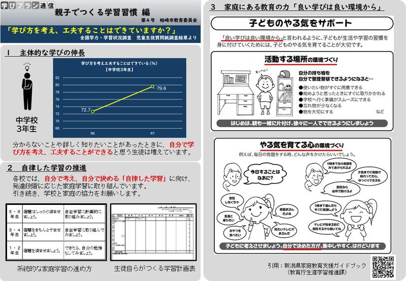 学びプラン通信「親子で作る学習習慣~学び方を考え、工夫することはできていますか?~」 投稿日時 : 01/06 サイト管理者 柏崎市教育委員会からの「学びプラン通信」第4号では、「親子で作る学習習慣~学び方を考え、工夫することはできていますか?~」が特集されています。「よい学びはよい環境から」と言われ、子どもが生活や学習の習慣を身に付けていくためには、「活動する場所の環境づくり」と「やる気を育てる心の環境づくり」が大切とのことです。まもなく、学校が再開します。学校とご家庭で「よい環境」を作っていけるよう、ご協力をお願いいたします。