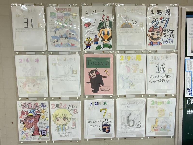 今日は2月6日です。今年の卒業式は3月6日に行われるので、卒業式まであと1か月(4週間)となりました。3年生の教室には、クラスの一人一人が作成した、卒業までの「カウントダウンカレンダー」が掲示されています。1枚1枚のカレンダーに、それぞれの個性が表れています。仲間へのメッセージに込められた思いを大切にし、卒業に向けての残り1か月を過ごしてほしいと思います。