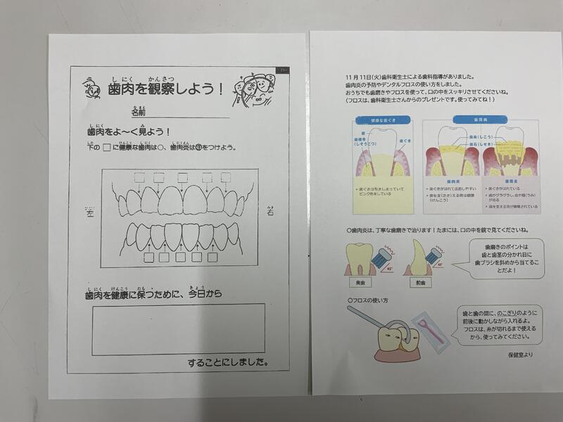 1年生は歯科衛生士さんを迎えて、「歯科保健指導」を行いました。自分の歯肉の状態を観察し、歯肉炎の予防の大切さについて学びました。歯肉炎は、ていねいな歯磨きで予防することができます。いつまでも自分の歯を健康な状態に保てるように意識していきましょう。