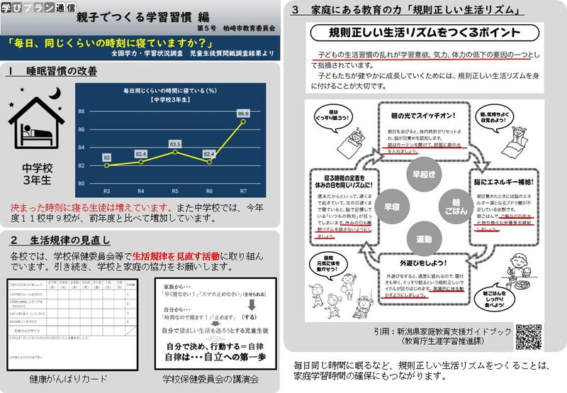 柏崎市教育委員会発行の「学びプラン通信」第5号では、「親子で作る学習習慣~毎日、同じくらいの時刻に寝ていますか?~」が特集されています。冬休み中は、気を抜いてしまうと規則正しい生活が乱れがちです。生活習慣の乱れが学習意欲、気力、体力の低下の要因の一つとして指摘されています。子どもたちが健やかに成長していくためには、規則正しい生活リズムを身に付けることが大切とのことです。毎日同じ時間に眠るなど、規則正しい生活リズムをつくることは、家庭学習時間の確保にもつながります。ご家庭でのご支援をよろしくお願いいたします。