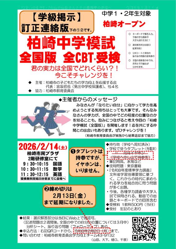 1・2年生は2日間の後期期末テストが始まりました。定期テストとは別に、2月14日(土)には、市内の中学1・2年生を対象に、「柏崎中学模試」が行われます。こちらを任意で受験する生徒もいるようです。このテストは、自分の学力が全国の中でどの程度の位置なのかを知ることができるテストだそうです。学習用タブレットを使って解答し、分析シートや振り返り問題も提供されるようです。受験を希望する人は、2月13日(金)まで申し込むことができます。