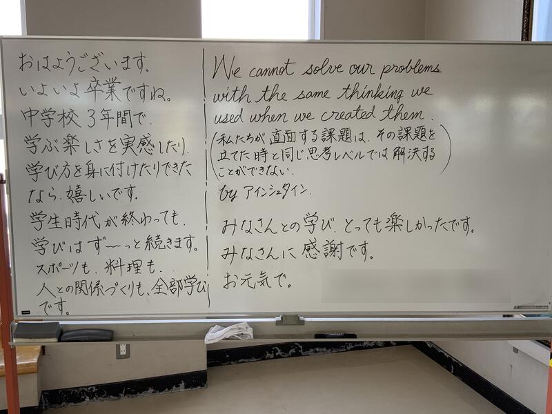 今日は「3年生を送る会」を行いました。これまで学校をリードしてきた3年生に対して、1・2年生が感謝の気持ちを伝える大切な行事です。3年生に関するクイズやスライドショーで盛り上がり、その後、お世話になった先生方からのメッセージをいただき、最後に全校生徒で集合写真を撮影しました。これまでの思い出を振り返るひとときとなりました。